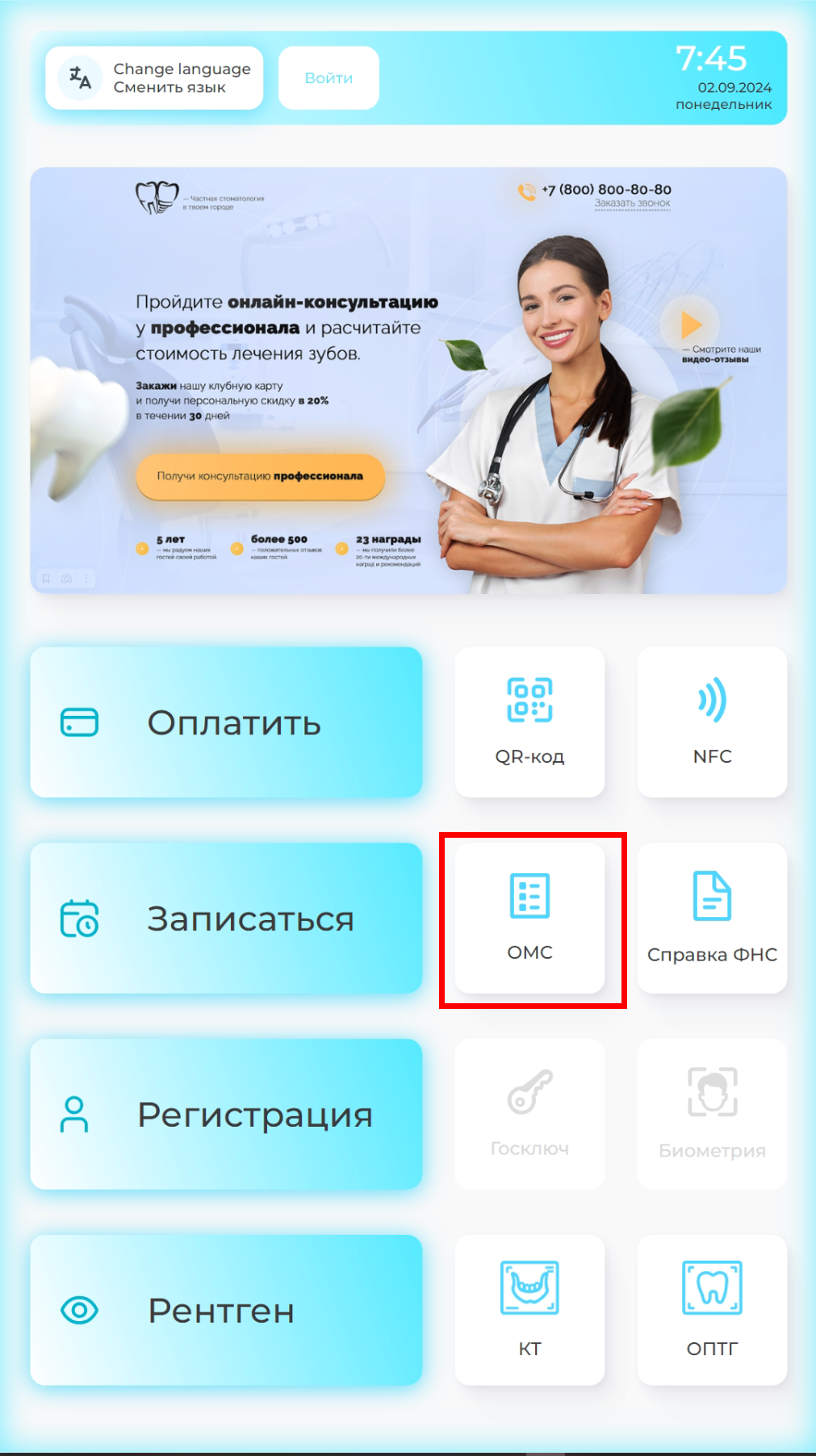 Для записи через систему ОМС - Подойдите к стенду и нажмите кнопку ОМС