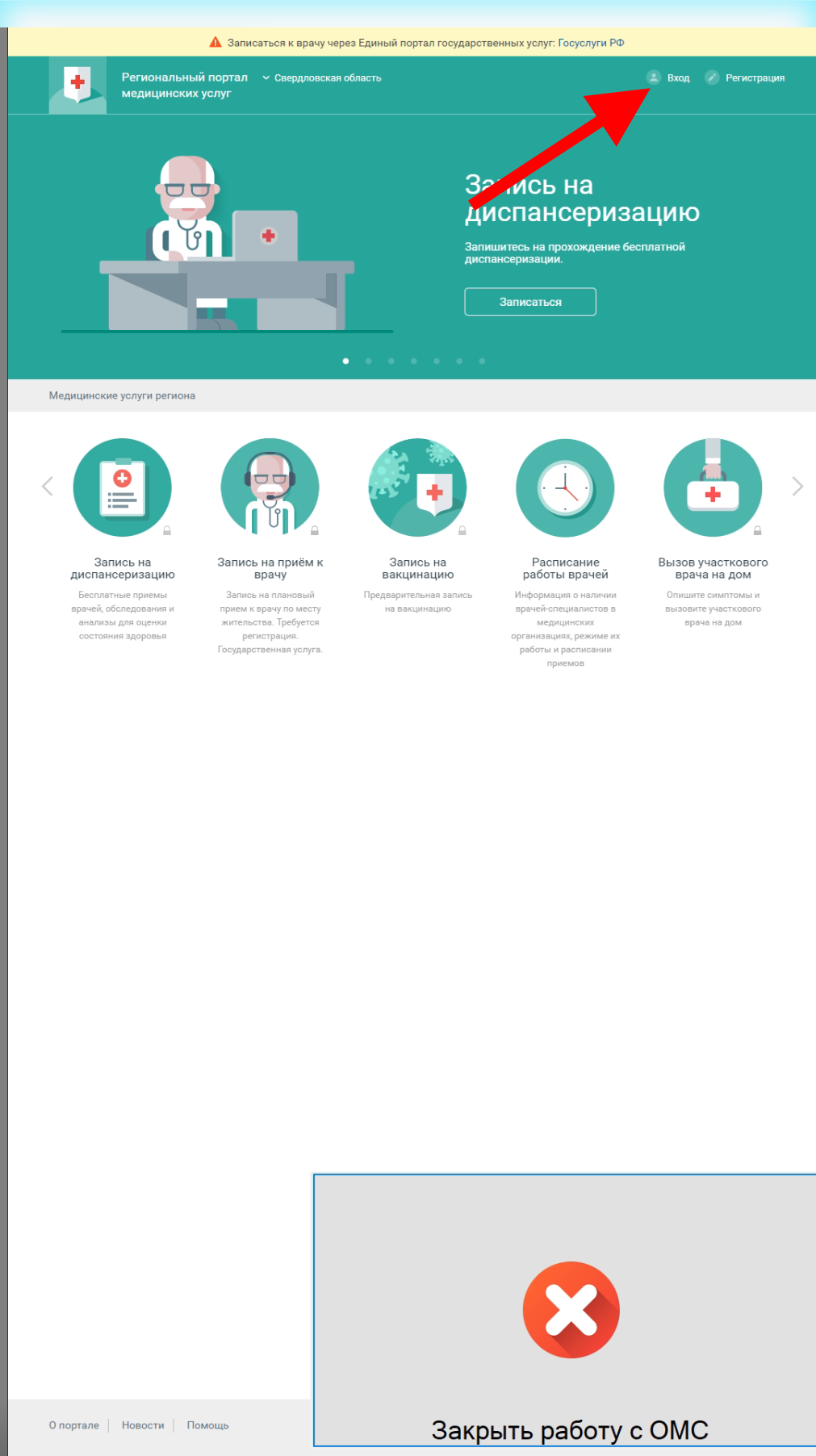 Откроется подсистема записи на ОМС. Справа сверху нажмите "ВХОД".